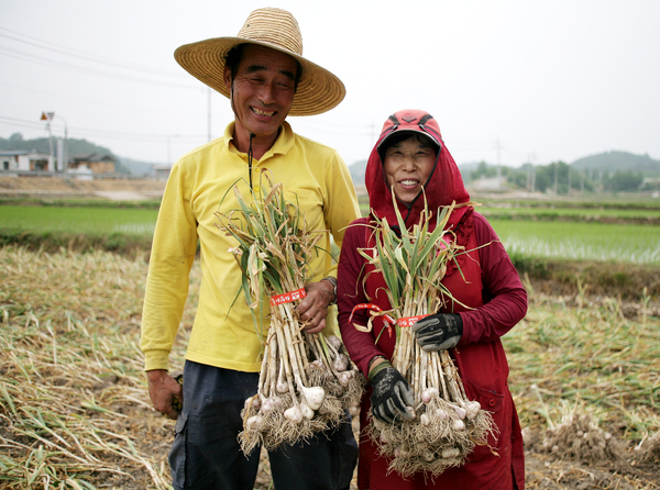 | ▲ 한톨 대표 부부가 우수마을기업 선정를 축하하고 있다. | ||