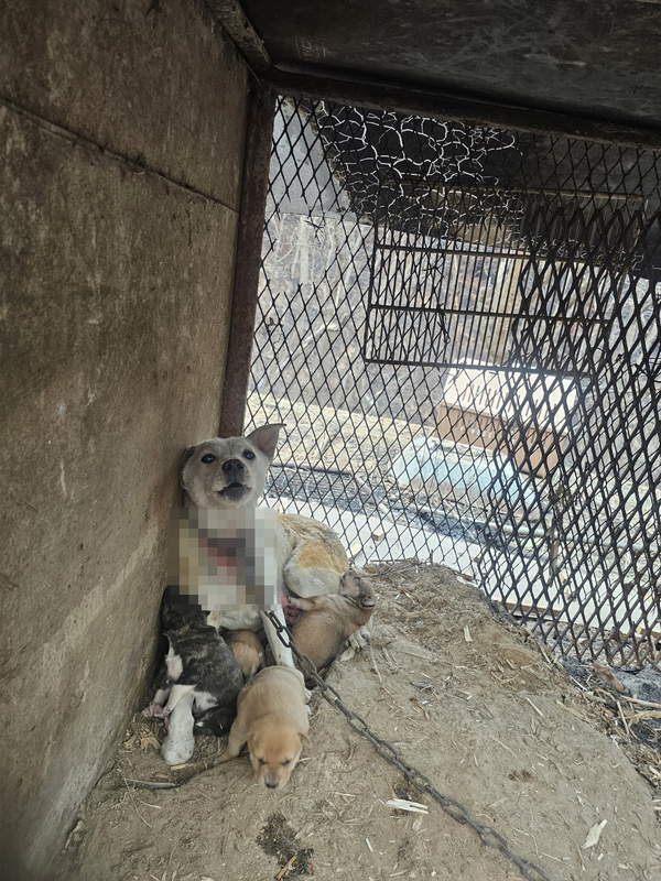 | ▲ 목에 심각한 상처를 입은 어미견 옆에 새끼 강아지들이 모여 있다. 루시의 친구들 제공 | ||