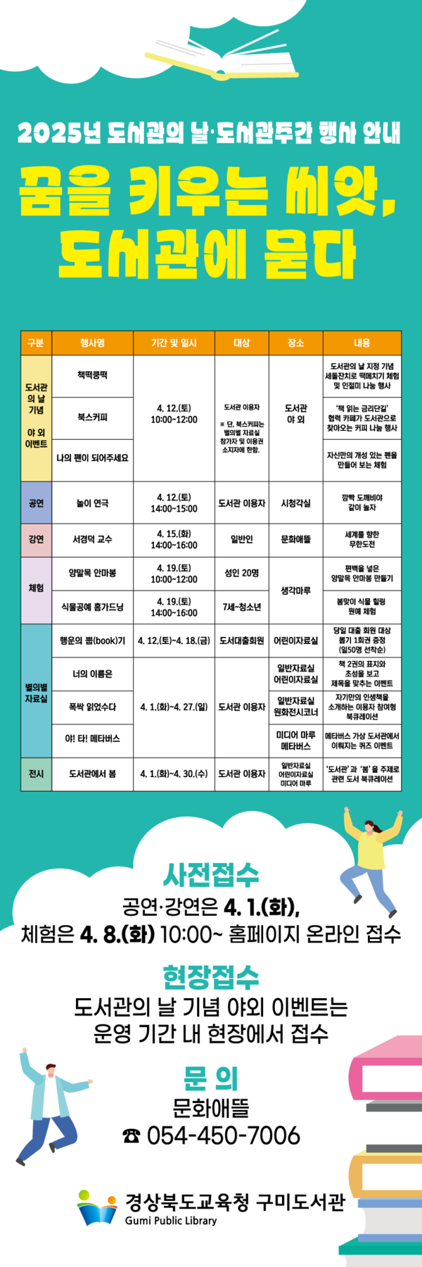 도서관의 날·도서관 주간 행사 관련 자세한 내용은 구미도서관 누리집이나 문화애뜰(450-7006)로 문의하면 된다.