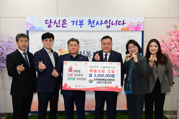 ▲ 산불 피해 복구 성금 전달식. 김천시 제공 민주평화통일자문회의 김천시협의회는 지난 7일, 산불 피해 복구를 위한 특별 모금에 200만원을 기부했다. 이번에 전달된 성금은 최근 경북지역에서 발생한 대형 산불로 인해 삶의 터전을 잃은 이재민들을 돕기 위해 마련됐으며, 피해 주민들의 일상 회복과 지역 복구를 위한 다양한 사업에 사용될 예정이다. 최병근 부회장은 "예기치 못한 화마로 큰 상처를 입은 이웃들에게 조금이나마 위로와 희망을 전하고 싶었으며, 함께 모은 이 마음이 피해 주민들이 하루빨리 일상으로 복귀하는 데 힘이 되기를 바란다"고 전했다.