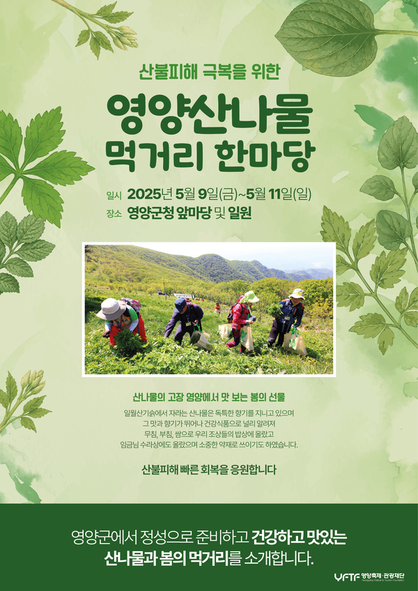 경북 영양군은 최근 발생한 산불로 인해, 올해 예정되었던 ‘영양산나물축제’를 대신해 지역의 회복과 치유에 초점을 맞춘 특별 행사, ‘영양산나물 먹거리 한마당’을 오는 5월 9일부터 11일까지 3일간 영양군청 앞마당 및 일원에서 개최한다고 밝혔다.