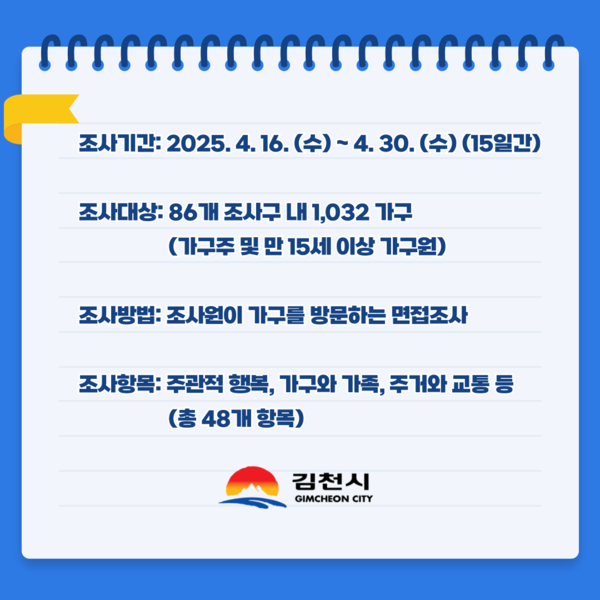 이번 조사는 김천시에 거주하는 1032가구의 만 15세 이상 가구주와 가구원을 대상으로 진행되며, 조사 항목은 주관적 행복, 가구와 가족, 주거와 교통, 교육, 소득과 소비 등 총 11개 분야의 42개 공통 항목과 김천시 특성에 맞춘 6개 항목을 포함한 48개 항목으로 구성된다.