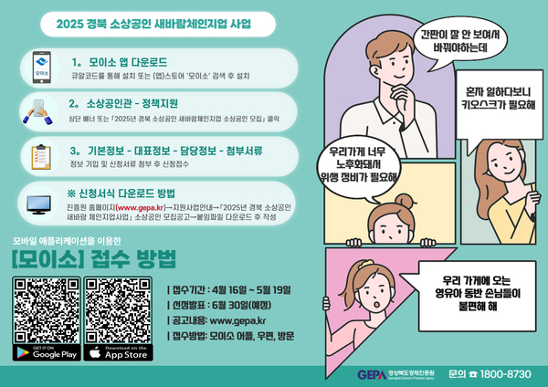 접수 기간은 5월 19일까지이며 ‘모이소’앱, 우편 또는 방문을 통해 접수할 수 있다. 자세한 사항은 시 홈페이지와 경상북도 경제진흥원에서 확인할 수 있다.