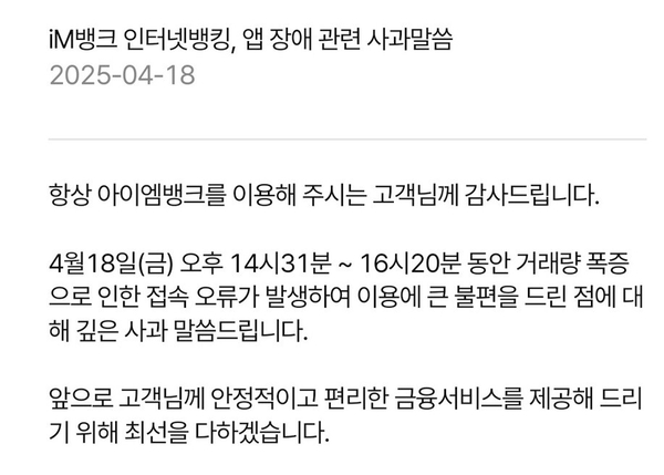 iM뱅크 측은 공식 안내문을 통해 "서비스 이용에 큰 불편을 드린 점 깊이 사과드린다"며 "안정적이고 편리한 금융서비스를 제공하기 위해 최선을 다하겠다"고 밝혔다.