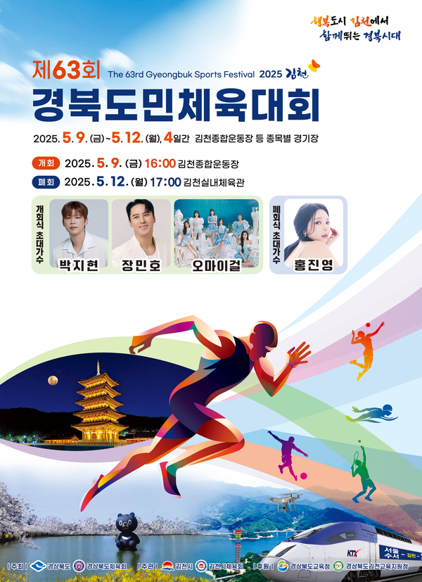 경상북도는 9일 김천종합운동장에서‘행복도시 김천에서, 함께뛰는 경북시대’를 슬로건으로 제63회 경북도민체육대회 개회식을 열고, 12일까지 4일간의 본격적인 열전에 돌입한다.