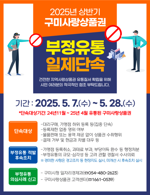 박영희 일자리경제과장은 "구미사랑상품권은 지역 내 소비를 촉진하고 소상공인을 지원하는 중요한 수단으로 부정유통을 강력히 차단해 상품권의 신뢰를 높이고 시민 누구나 안심하고 사용할 수 있는 환경을 만들겠다"고 했다.