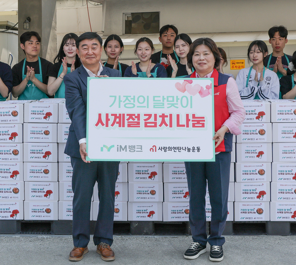 이준혁 iM뱅크 공공금융본부장은 “물가 상승과 원재료 비용 부담으로 김치를 직접 담그기 어려운 상황에서 이번 나눔 활동을 통해 지역 사회의 따뜻한 정을 나눌 수 있어 기쁘다”며 “iM뱅크는 앞으로도 소외된 이웃에게 희망을 전하고 따뜻한 지역사회를 만드는 데 앞장서는 다양한 사회공헌활동 방안으로 ESG경영에 나서겠다”고 말했다.