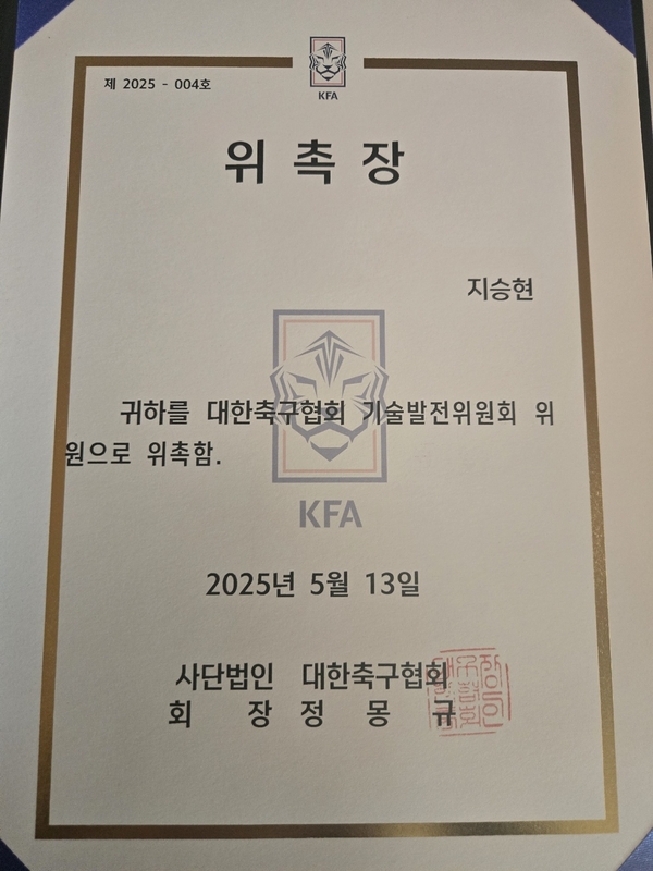 지승현 감독은 “대한민국 축구의 기술 발전이라는 중대한 과제에 참여하게 돼 무거운 책임감을 느낀다”며 “현장 경험을 바탕으로 보다 실질적인 정책과 방안을 제시해 유소년 선수들이 올바르게 성장할 수 있는 환경을 만들겠다”고 소감을 밝혔다.