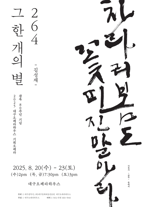 올해 광복 80주년을 기념해 특별 공연으로 선보이는 ‘264, 그 한 개의 별’은 ‘카메라타 창작오페라 연구회’ 사업의 결실로 제10회 대구국제오페라축제 오페라 대상을 수상한 ‘청라언덕’의 작곡가 김성재와 2019년 대한민국오페라축제 대상을 받은 ‘윤심덕, 사의 찬미’의 대본가 김하나가 참여한 작품이다.