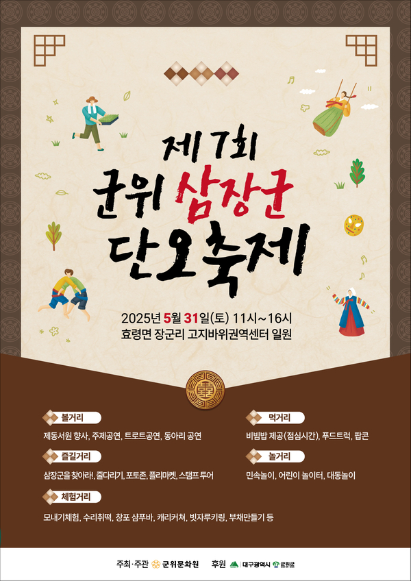 김진열 군수는 “삼장군 단오축제는 군위의 찬란한 역사와 전통문화가 어우러진 대표적인 향토축제”로 “군민과 관광객 모두가 함께 즐기고 소통할 수 있는 뜻깊은 자리가 되길 기대한다.”고 말했다.
