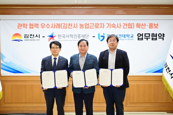 김천시는 지난 28일, 한국사학진흥재단, 경북보건대와 관학 협력 우수사례 확산 및 홍보를 위한 업무협약을 체결했다.