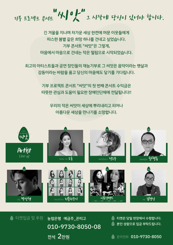 이 씨는 “아티스트들의 재능기부를 통해 지역사회를 기반으로 기부 나비효과가 이어지길 원한다”라며 “예술인에게는 무대의 기쁨, 관객들은 문화적 체험, 장애인들에게는 도움이 되는 기회가 될 것”이라고 밝혔다.