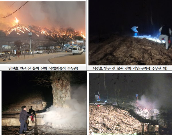 급식실 가스통을 함께 들어 옮기는 한편, 학교 소화기를 총동원해 불길 확산을 저지했다. 새벽 내내, 바람이 불 때마다 다시 불씨가 옮겨 붙을까 구명삼 주무관을 포함한 남선초 교직원들은 뜬눈으로 밤을 지새우며 삽으로 흙을 퍼서 불씨를 덮고 세수대야에 받은 물로 잔불을 정리했다.