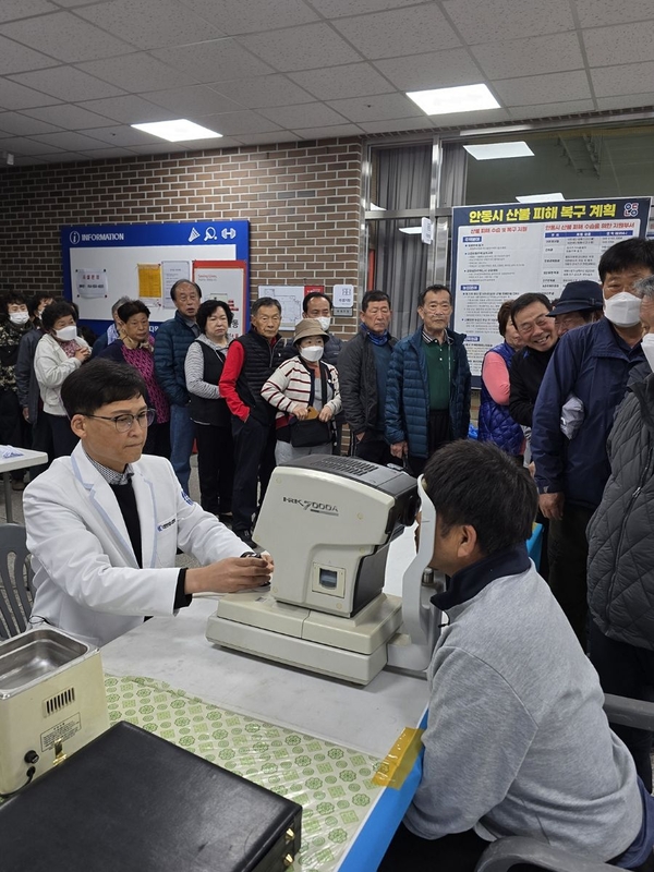 | ▲ 대한안경사협회는 산불이재민 대피소에서 시력 측정 및 맞춤형 돋보기 지원을 했다. 안동시 제공 | ||