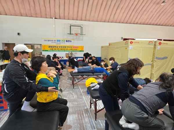 | ▲ 대한물리치료사협회와 안동과학대학교 물리치료학과 학생들이 산불이재민 대피소에서 물리치료를 실시하고 있는 모습. 안동시 제공 | ||