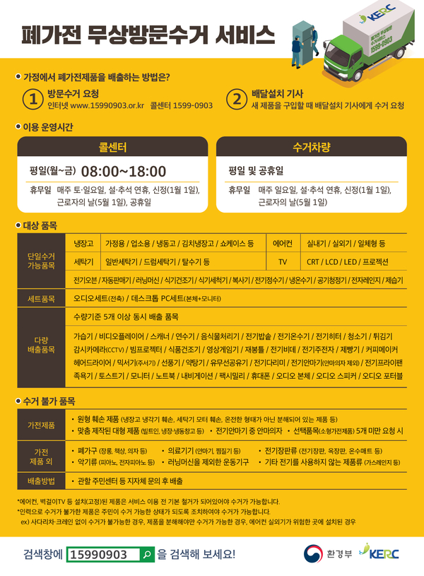 서비스 이용을 위해서는 사전 수거 예약이 필요하며, 전화(1599-0903) 또는 홈페이지(www.15990903.co.kr)를 통해 간편하게 신청할 수 있다. 수거 품목은 냉장고, 세탁기, TV 등 대형 가전제품의 경우 단일 품목만으로도 수거가 가능하며, 헤어드라이기, 노트북, 밥솥 등과 같은 소형 가전제품은 5개 이상일 경우 수거 신청이 가능하다.