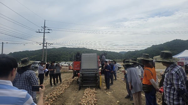 양파 수확 작업의 기계화 현장을 시연하고 안정적인 기계화 수확 기술을 보급하기 위해 마련된 이번 시연회에서는 김천시 양파 산업 현황에 대한 설명과 양파 줄기 절단기, 굴취기, 수집기 3종류의 기계 수확 현장 연시가 이루어졌다.