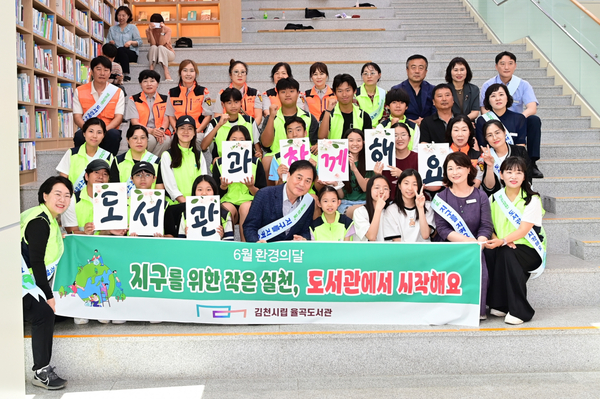 | ▲ '지구를 위한 작은 실천, 도서관에서 시작해요!'에 참여한 시민들이 기념촬영을 하고 있다. 김천시 제공 | ||