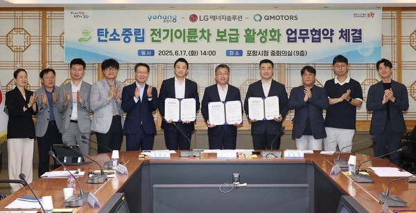 포항시는 17일 시청 중회의실에서 ㈜LG에너지솔루션(대표 김동명), ㈜큐모터스(대표 김종현)와 ‘탄소중립 전기이륜차 보급 활성화를 위한 업무협약’을 체결했다.