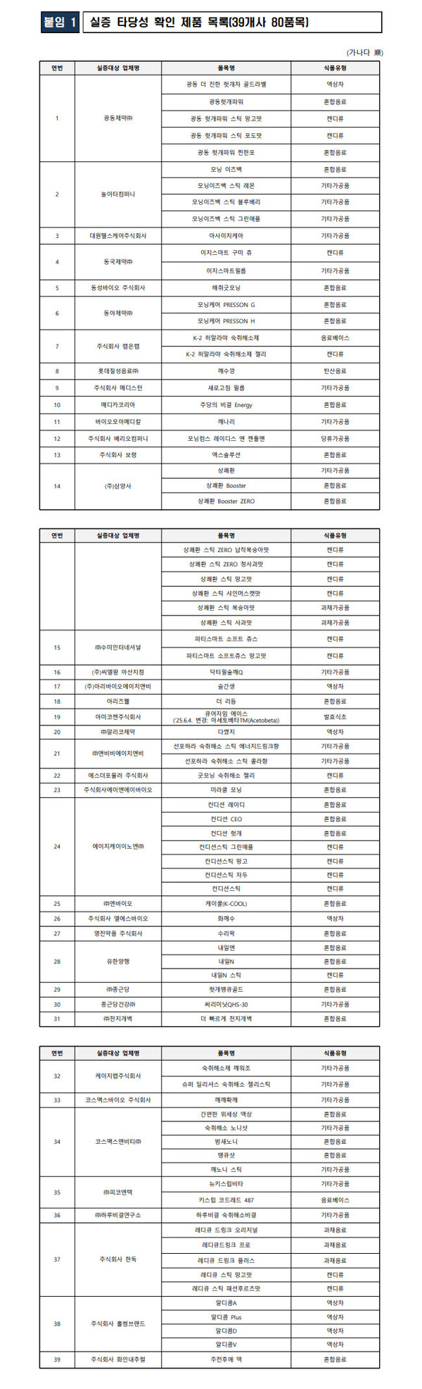 식약처는 숙취해소 관련 표시·광고의 객관성·타당성이 확인된 이 같은 39개사 80개 품목을 식품안전나라(www.foodsafetykorea.go.kr)에 공개할 계획이다.