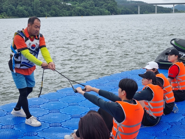 이번 교육은 이론과 실습을 병행한 현장 중심의 실무 체험 프로그램으로 학생들은 수상스키의 구조와 조작 원리, 안전 장비 사용법 등 기본 교육을 받은 후 직접 수역에 나가 조종을 체험했다.