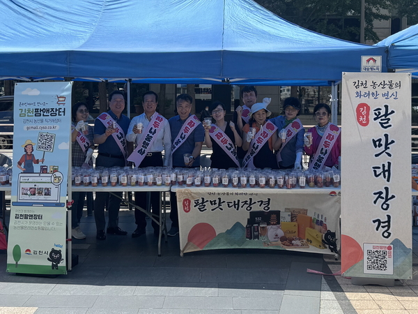 현장에서는 김천시에서 개설한 직거래장터 '김천팜앤장터(gcmall.cyso.co.kr/shop)'를 홍보하기 위해 스티커가 부착된 컵에 김천 자두를 담아 시민들에게 나눠 주었고 김천 대표 특화 음식 개발로 탄생한 '팔맛대장경'과 김천의 주요 관광지 등 다양한 시정 정보도 함께 홍보했다.