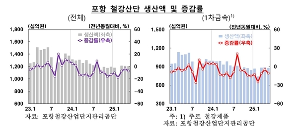 포스코 포항제철소의 조강 생산량은 전년 동월 대비 1.5% 줄었고, 포항 철강산업단지의 전체 생산액도 7.2% 감소하며 철강업 전반의 부진이 이어졌다.