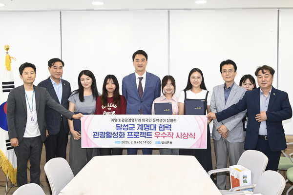 달성군은 9일 지역 관광지를 체험하고 소개하는 콘텐츠 제작 프로젝트에 참여한 계명대학교 관광경영학과 유학생들을 대상으로 시상식을 열고, 우수작에 상장과 기념품을 전달했다.