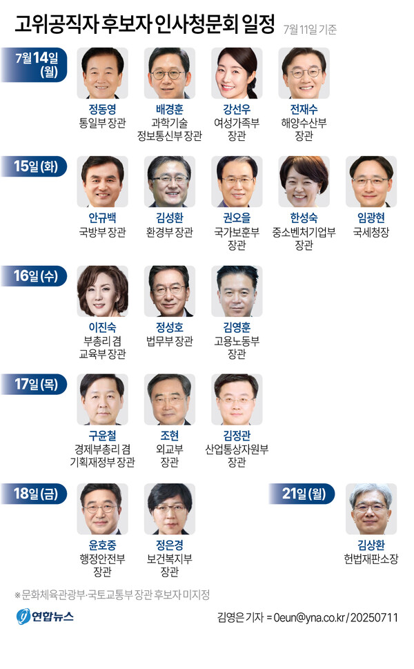 강선우 여성가족부·정동영 통일부·배기훈 과학기술정보통신부·전재수 해양수산부장관 후보자를 시작으로, 15일에는 국방부 안규백 ·한성숙 중소벤처기업부 ·김성환 환경부 ·한성숙 중소기업벤처부 ·권오을 국가보훈부 장관 후보자가 국회에 출석한다