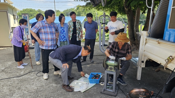 ▲ 바람테크는 지난 8일과 10일 감천면에서 칼갈이 봉사활동을 진행했다. 김천시 제공 바람테크(김명규 대표)는 지난 8일 감천면 무안리, 10일 금송리·광기1리 마을회관에서 칼갈이 봉사활동을 펼쳤다. 바람테크는 바쁜 영농철을 맞아 아침 일찍 주민들이 맡기고 간 칼을 정성껏 갈아주며 안전한 사용법도 안내하는 등 실질적인 편의를 제공했다. 마을 주민 천 모 씨는 "요즘 칼이 녹슬고 무뎌져 불편했는데 이렇게 마을회관까지 찾아와 칼을 갈아주셔서 감사드리며, 덕분에 녹슨 칼날이 새것이 되었다."며 감사의 마음을 전했다.