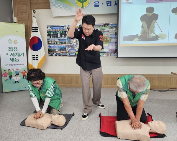 | ▲ 의성군 새마을회장과 임원이 심폐소생술(CPR)을 하고 있다. | ||