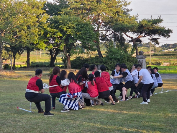 | ▲ 안계교촌농촌체험마을에서 미혼남녀 매칭 커플들이 줄다리기 팀빌 체육대회를 하고있다. | ||