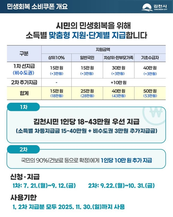이번 소비쿠폰은 6월 18일 기준 김천시에 주민등록이 되어있는 시민을 대상으로 소득별 맞춤형 차등 지급된다.