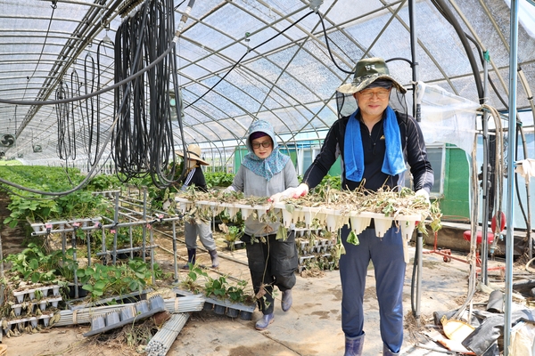| ▲ 지무진,박화자 의원, 김미자 사무과장이 비닐하우스 수해복구 현장에서 정리와 토사 제거를 하고있다. | ||