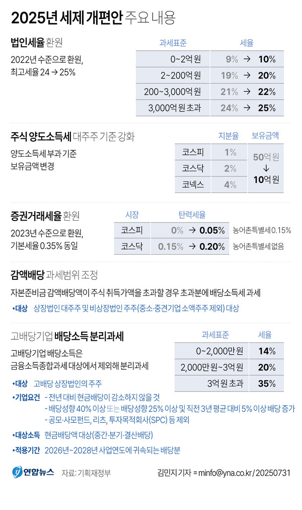 상장주식 양도소득세는 종목당 보유 기준이 기존 50억원에서 10억원으로 강화되며, 코스피·코스닥 시장의 증권거래세율은 각각 0.20%로 환원된다.