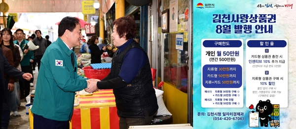 한편 김천시의 하반기 지역경제 활성화 사업은 평소 소상공인들과 시민들의 애환을 직접 발로 뛰며 들어왔던 배낙호 김천시장이 적극 추진해 이루어졌다. 지난 4월 보궐선거로 당선된 배 시장은 1호 결재로‘민생경제 활성화’를 꼽을만큼 지역경제 활성화 시책에 대해 시급한 당면과제로 추진하고 있다.