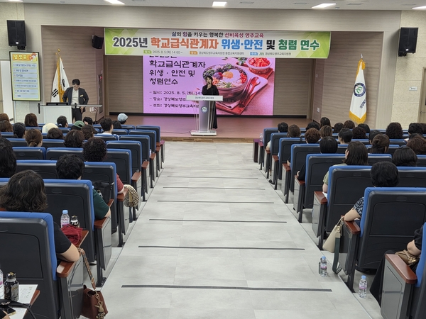 경상북도영주교육지원청이 지난 5일 통합교육지원센터 4층 강당에서 관내 유․초․중․고 조리교에서 근무하는 영양(교)사, 조리사 및 조리원 200여명을 대상으로 ‘2025년 학교급식관계자 위생․안전 및 청렴 연수’를 실시했다.