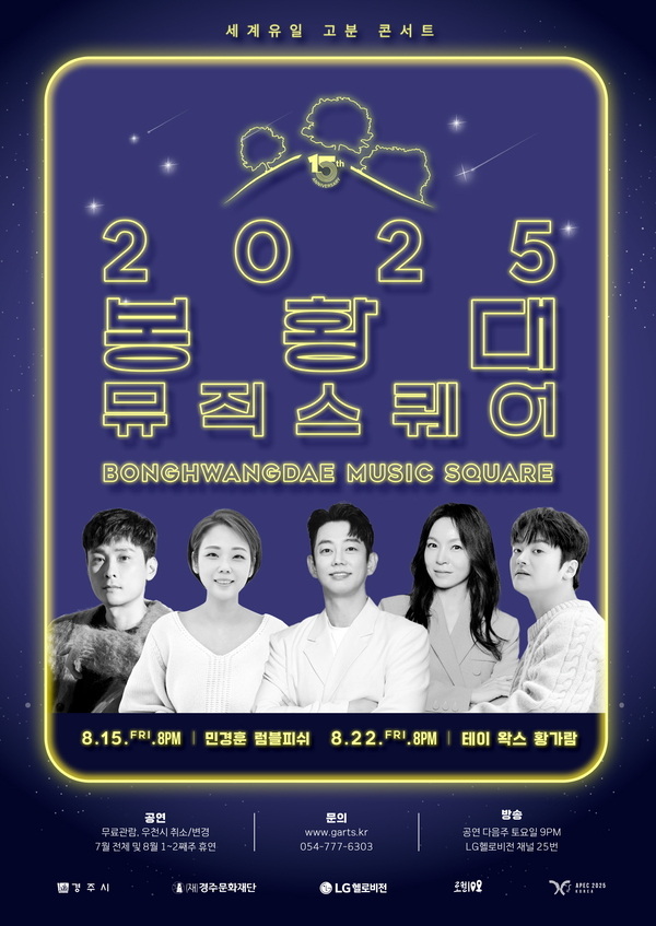 경주시는 세계 유일의 고분 콘서트 ‘봉황대 뮤직스퀘어’가 8월에도 화려한 라인업과 함께 관객을 맞이한다고 밝혔다. 이번 공연은 15일과 22일 오후 8시, 경주 봉황대 특설무대에서 무료로 진행되며, 우천 시에는 취소된다. 공연 실황은 다음 주 토·일 오후 9시 LG헬로비전 채널 25번에서 방영된다.