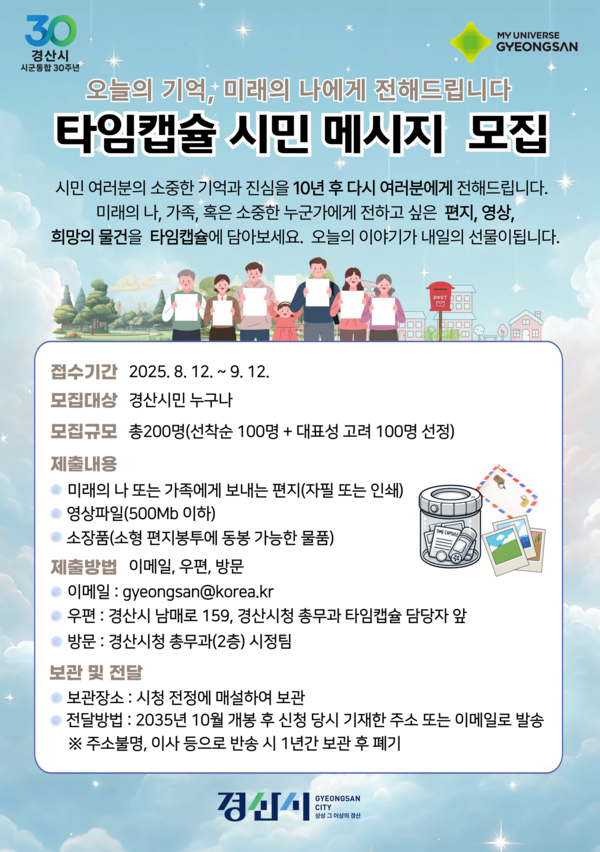 참여를 원하는 시민은 △미래에 전하고 싶은 편지 △영상 메시지 △소형 편지봉투에 담을 수 있는 소장품을 준비해, 온라인(이메일 gyeongsan@korea.kr), 우편 또는 방문 접수(경산시 총무과 타임캡슐 담당자)를 통해 신청할 수 있다.