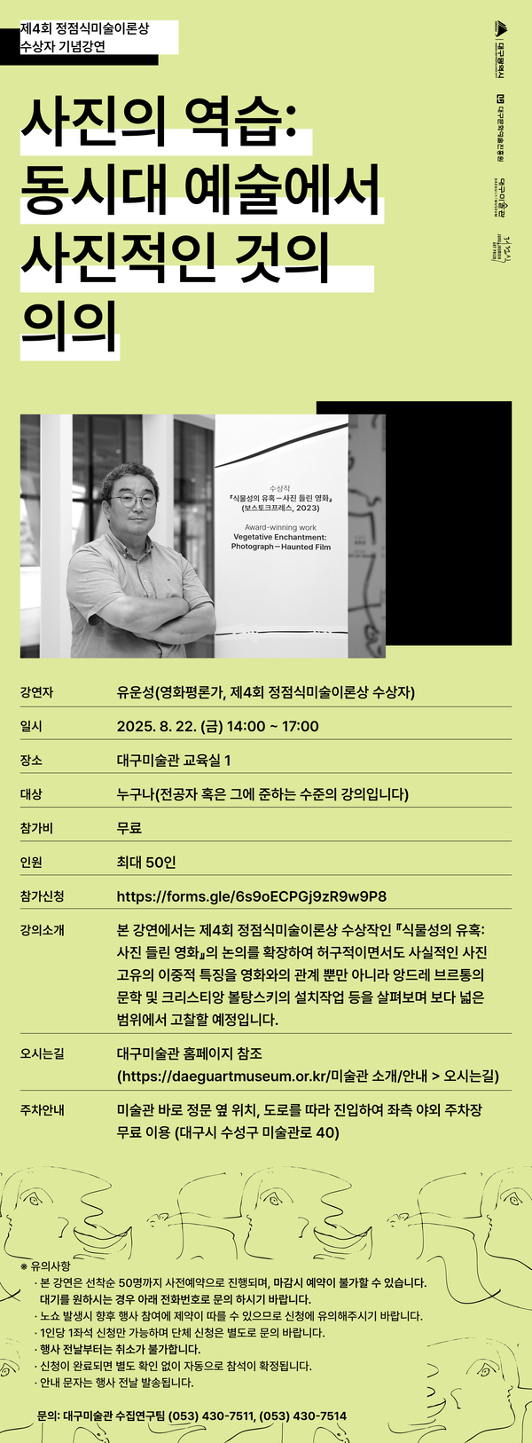 대구미술관에 따르면 지난 6월 선정된 이 상의 수상자 영화평론가 유운성은 이번 강연을 통해 수상작 '식물성의 유혹'의 이론적 탐색을 확장한다.
