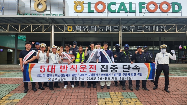 영덕경찰서는 지난 12일 오후 2시경 영덕군 영해휴게소에서, 포항국토관리사무소‧영덕경찰서 합동으로 “5대 반칙 운전 근절 및 교통법규 준수” 캠페인을 실시했다. ‘5대 반칙 운전’은 ①새치기 유턴, ②교차로 꼬리물기, ③끼어들기, ④비긴급 구급차 법규위반, ⑤버스전용차로 위반이다. 영덕경찰서 제공