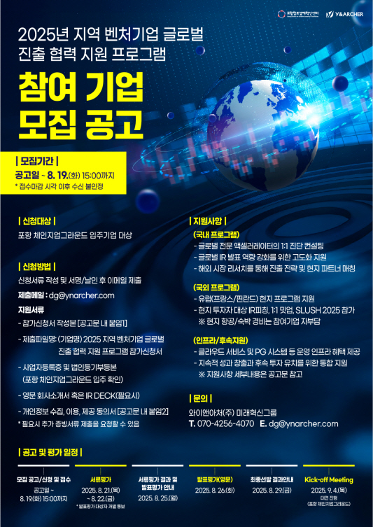 포항창조경제혁신센터는 ‘2025년 지역 벤처기업 글로벌 진출 협력 지원사업’에 참여할 기업을 오는 19일까지 모집한다고 밝혔다.