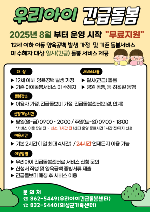 ‘우리아이 긴급돌봄’은 의성군가족센터 긴급돌보미가 `일시(긴급) 돌봄서비스, 병원 동행, 등·하굣길 동행` 서비스를 제공하는 사업이다.