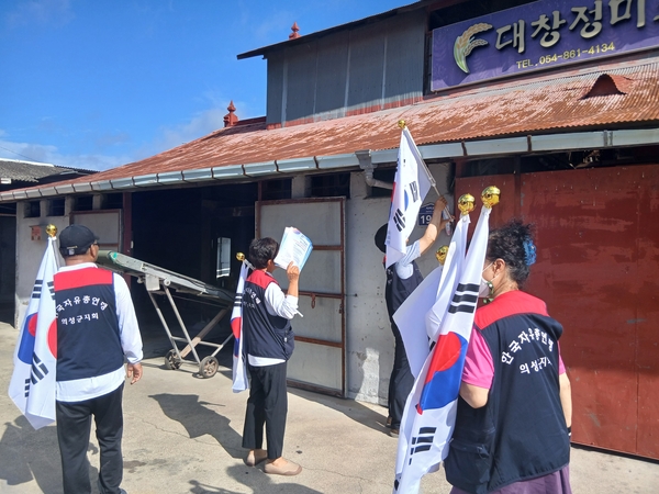 | ▲ 한국자유총연맹 의성군지회원들이 태극기 게양을 하고 있다. | ||