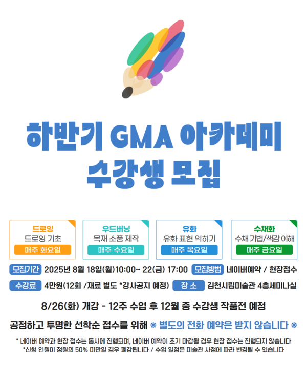 김천시립미술관은 시민들의 문화예술 향유 기회를 확대하고 창의적 표현 활동을 지원하기 위해 이달 18일부터 22일까지 올해 하반기 GMA 아카데미 수강생을 모집한다고 밝혔다.