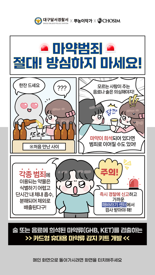 달서경찰서에 따르면 이번 홍보툰은 ‘물뽕’으로 불리는 GHB와 케타민 등 마약 성범죄에 악용되는 약물의 특성과 위험성을 알기 쉽게 그려냈다. 또 경찰이 새롭게 도입한 카드형 휴대용 마약 탐지 키트 사용법도 함께 담아 실제 대응력을 높이는 데 초점을 맞췄다.