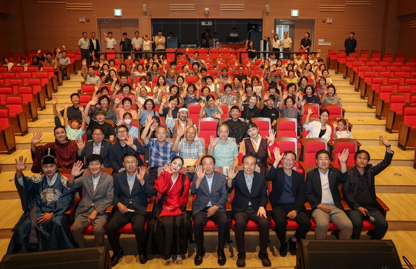 | ▲ 김주수 군수, 이충원, 최태림 도의원, 최훈식 의장과 군의원, 기관단체장, 군민, 관계자 등이 뮤지컬 `독도장군 장한상` 제작발표회를 관람하고 있다. | ||