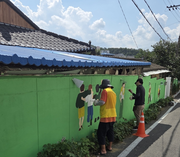 | ▲ 의성군 단체 회원들이 골목길 벽화를 그리고 있다. | ||