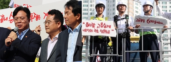 | ▲ 구미 고공 농성현장 찾은 정청래 민주당 대표와 김영훈 노동부장관 | ||