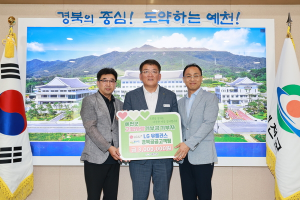 LG유플러스 경북공공고객팀(팀장 이동활)이 1일 예천군청을 방문 김학동 군수를 통해 지역 발전과 주민 복지 증진을 위해 300만 원의 고향사랑기부금을 지정 기탁했다. 김학동 군수는 “지역사회 발전을 위한 지속적인 응원과 따뜻한 나눔 실적에 깊이 감사드린다”고 말했다.